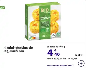 Actuellement, 4 mini-gratins de légumes bio est en promotion chez Picard. Toutes les informations utiles comme le prix, les conditions et la durée de validité sont affichées sur cette page. Consultez également les promotions similaires pour 4 mini-gratins de légumes bio, afin de faire le meilleur choix. La promo 4 mini-gratins de légumes bio est valable du 20-04-2026 au 03-05-2026. Si elle est expirée, regardez les autres offres équivalentes. Vous pouvez aussi suivre cette catégorie de produit pour être alerté lorsqu’une nouvelle promotion 4 mini-gratins de légumes bio apparaît chez Picard.Questions fréquemment posées au sujet de 4 mini-gratins de légumes bio