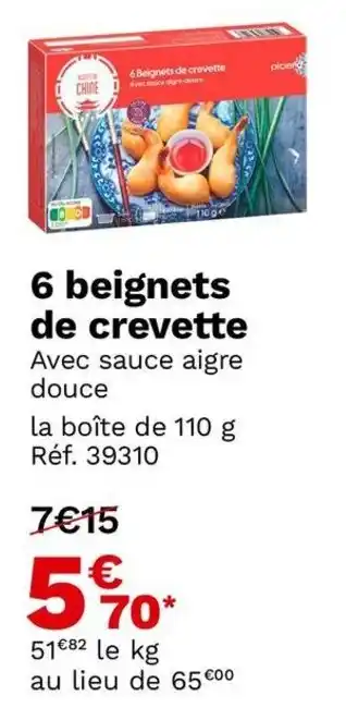 En plus de l'offre 6 beignets de crevette, Picard propose une large gamme de produits. Consultez le Catalogue Picard hebdomadaire pour découvrir les meilleures offres et promotions. En plus de 6 beignets de crevette, il y a aussi : Beignets de crevette, Beignets de crevette & 6 beignets crevette.