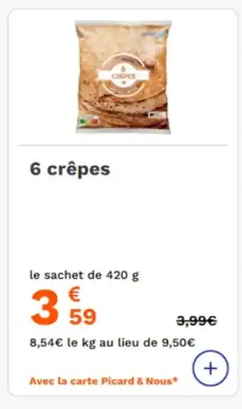 En plus de l'offre 6 crêpes, Picard propose une large gamme de produits. Consultez le Catalogue Picard hebdomadaire pour découvrir les meilleures offres et promotions. En plus de 6 crêpes, il y a aussi : 6 crêpes CARREFOUR, 6 CRÊPES MAISON & 6 CRÊPES PAYSAN BRETON.