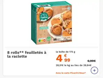 En plus de l'offre 8 rolls feuilletés à la raclette, Picard propose une large gamme de produits. Consultez le Catalogue Picard hebdomadaire pour découvrir les meilleures offres et promotions. En plus de 8 rolls feuilletés à la raclette, il y a aussi : 8 rolls feuilletés à la raclette, 4 Feuilletés raclette et lardons & 2 chicken rolls.