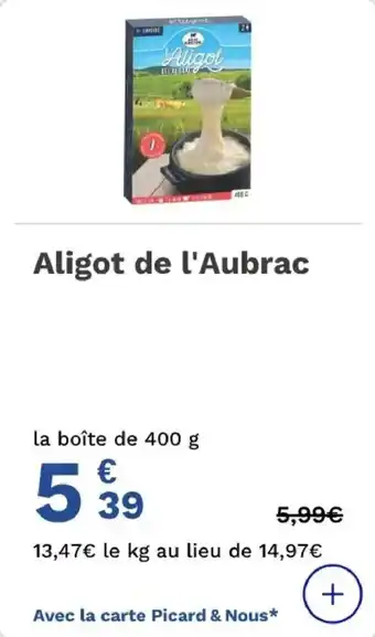 Le prix de l'offre Aligot de l'aubrac se trouve également en haut de la page, ainsi que la date à laquelle l'offre est disponible. Vous pouvez également vérifier les prix dans le Catalogue Picard actuel ou sur le site Internet de Picard. Les offres vous permettent d'acheter les produits Picard au prix le plus bas.
