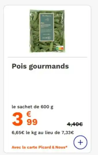 Le prix de l'offre Pois gourmands se trouve également en haut de la page, ainsi que la date à laquelle l'offre est disponible. Vous pouvez également vérifier les prix dans le Catalogue Picard actuel ou sur le site Internet de Picard. Les offres vous permettent d'acheter les produits Picard au prix le plus bas.
