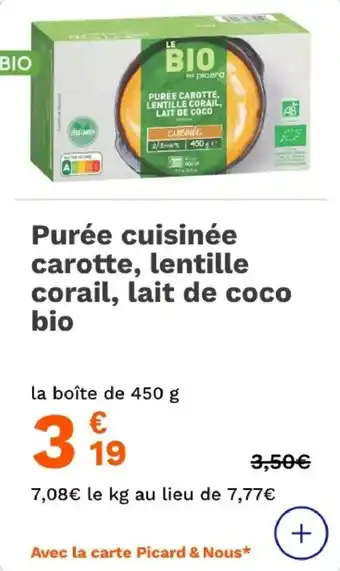 Actuellement en offre chez Picard : Purée cuisinée carotte lentille corail lait de coco bio ✅ Valable du 19-01 au 4-03.