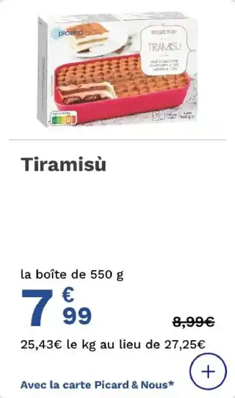 Le prix de l'offre Tiramisù se trouve également en haut de la page, ainsi que la date à laquelle l'offre est disponible. Vous pouvez également vérifier les prix dans le Catalogue Picard actuel ou sur le site Internet de Picard. Les offres vous permettent d'acheter les produits Picard au prix le plus bas.