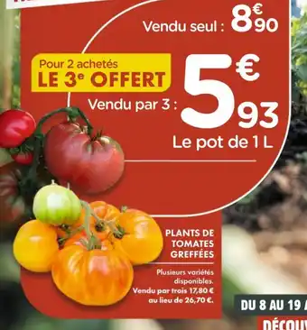 Quand Plants de tomates greffées sera-t-elle en promotion ? Ou encore : "Est-ce que Plants de tomates greffées sera en promotion la semaine prochaine ?" C’est une question fréquente. Beaucoup de consommateurs établissent leur liste de courses à l’avance. Pour cette raison, nous mettons en ligne les informations sur les promos à venir dès qu’elles sont connues. Cela vous permet de planifier vos achats et de faire de bonnes affaires. Consultez régulièrement notre site pour savoir si une nouvelle promo sur Plants de tomates greffées arrive bientôt chez Point Vert.Questions fréquemment posées au sujet de Plants de tomates greffées