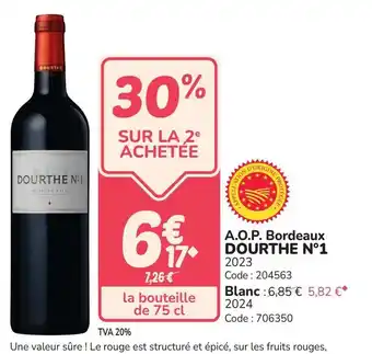 En plus de l'offre A.o.p. bordeaux dourthe n°1, Promocash propose une large gamme de produits. Consultez le Catalogue Promocash hebdomadaire pour découvrir les meilleures offres et promotions. En plus de A.o.p. bordeaux dourthe n°1, il y a aussi : Dourthe - a.o.p bordeaux, Dourthe - a.o.p bordeaux & A.O.P Bordeaux LA GRANDE CUVÉE - DOURTHE.