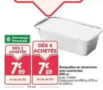 En plus de l'offre Barquettes en aluminium avec couvercles 900 cc, Promocash propose une large gamme de produits. Consultez le Catalogue Promocash hebdomadaire pour découvrir les meilleures offres et promotions. En plus de Barquettes en aluminium avec couvercles 900 cc, il y a aussi : ALPHACEL Barquettes scellables 500 cc, Barquettes amande & Barquettes traiteur.