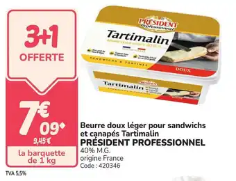 Actuellement en offre chez Promocash : Beurre doux léger pour sandwichs et canapés tartimalin président professionnel ✅ Valable du 31-03 au 25-04.