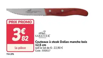 En plus de l'offre Couteaux à steak Dallas manche bois, Promocash propose une large gamme de produits. Consultez le Catalogue Promocash hebdomadaire pour découvrir les meilleures offres et promotions. En plus de Couteaux à steak Dallas manche bois, il y a aussi : Couteaux à steak manche bois, 12 couteaux à steak & SIMPL Couteaux à steak 2 rivets.