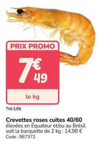 En plus de l'offre Crevettes roses cuites 40/60, Promocash propose une large gamme de produits. Consultez le Catalogue Promocash hebdomadaire pour découvrir les meilleures offres et promotions. En plus de Crevettes roses cuites 40/60, il y a aussi : Crevettes roses entières cuites, Crevettes cuites & Crevettes cuites.
