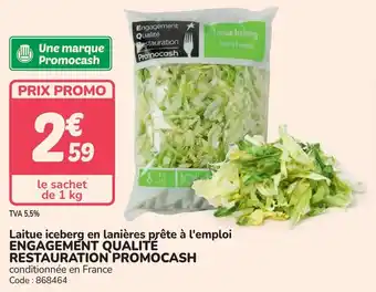 Le prix de l'offre Laitue iceberg en lanières prête à l'emploi engagement qualite restauration promocash se trouve également en haut de la page, ainsi que la date à laquelle l'offre est disponible. Vous pouvez également vérifier les prix dans le Catalogue Promocash actuel ou sur le site Internet de Promocash. Les offres vous permettent d'acheter les produits Promocash au prix le plus bas.