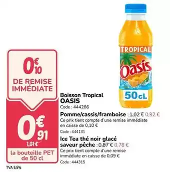 En plus de l'offre Oasis - boisson tropical, Promocash propose une large gamme de produits. Consultez le Catalogue Promocash hebdomadaire pour découvrir les meilleures offres et promotions. En plus de Oasis - boisson tropical, il y a aussi : BOISSON AUX FRUITS TROPICAL “OASIS”, OASIS Tropical & OASIS Tropical.