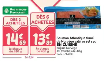 Actuellement, Saumon atlantique fumé de norvège salé au sel sec en cuisine est en promotion chez Promocash. Toutes les informations utiles comme le prix, les conditions et la durée de validité sont affichées sur cette page. Consultez également les promotions similaires pour Saumon atlantique fumé de norvège salé au sel sec en cuisine, afin de faire le meilleur choix. La promo Saumon atlantique fumé de norvège salé au sel sec en cuisine est valable du 30-04-2026 au 09-05-2026. Si elle est expirée, regardez les autres offres équivalentes. Vous pouvez aussi suivre cette catégorie de produit pour être alerté lorsqu’une nouvelle promotion Saumon atlantique fumé de norvège salé au sel sec en cuisine apparaît chez Promocash.Questions fréquemment posées au sujet de Saumon atlantique fumé de norvège salé au sel sec en cuisine