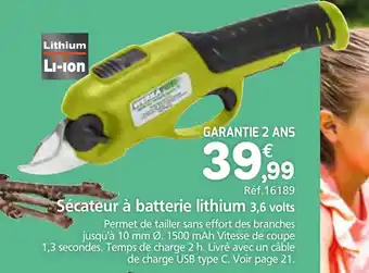 Le prix de l'offre Sécateur à batterie lithium 3,6 volts se trouve également en haut de la page, ainsi que la date à laquelle l'offre est disponible. Vous pouvez également vérifier les prix dans le Catalogue Provence Outillage actuel ou sur le site Internet de Provence Outillage. Les offres vous permettent d'acheter les produits Provence Outillage au prix le plus bas.