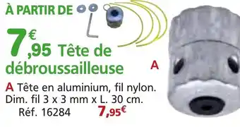 Le prix de l'offre Tête de débroussailleuse se trouve également en haut de la page, ainsi que la date à laquelle l'offre est disponible. Vous pouvez également vérifier les prix dans le Catalogue Provence Outillage actuel ou sur le site Internet de Provence Outillage. Les offres vous permettent d'acheter les produits Provence Outillage au prix le plus bas.