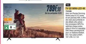L'offre est disponible dans plusieurs magasins, vérifiez tous les produits pour obtenir le Tcl tv qd mini-led 4k le moins cher. Si vous souhaitez savoir si l'article est en vente avec une plus grosse remise dans un autre magasin, consultez la catégorie 'Multimédia et Electroménager'. Ces offres pourraient aussi vous intéresser : Tcl tv qd mini-led 4k, Tcl tv qd mini-led 4k & TCL Tv qd mini-led 4k 75C69K.