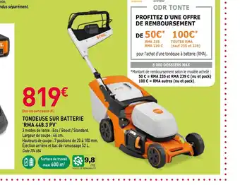Actuellement en offre chez RAGT Jardin & Maison : Tondeuse sur batterie rma 448.3 pv ✅ Valable du 1-04 au 18-04.