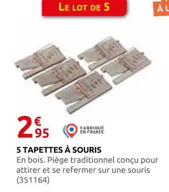 L'offre est disponible dans plusieurs magasins, vérifiez tous les produits pour obtenir le 5 tapettes à souris le moins cher. Si vous souhaitez savoir si l'article est en vente avec une plus grosse remise dans un autre magasin, consultez la catégorie 'Bricolage'. Ces offres pourraient aussi vous intéresser : 3 tapettes à souris, Souris avec os à rotir & Répulsif à souris et rats.