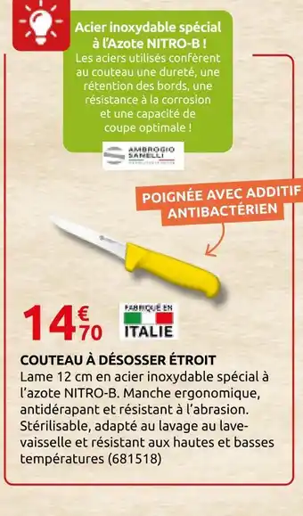 L'offre est disponible dans plusieurs magasins, vérifiez tous les produits pour obtenir le Couteau à désosser étroit le moins cher. Si vous souhaitez savoir si l'article est en vente avec une plus grosse remise dans un autre magasin, consultez la catégorie 'Bricolage'. Ces offres pourraient aussi vous intéresser : Couteau à désosser, Ambrogio sanelli - couteau à désosser & Couteau office.