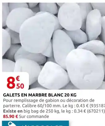 En plus de l'offre Galets en marbre blanc 20 kg, Rural Master propose une large gamme de produits. Consultez le Catalogue Rural Master hebdomadaire pour découvrir les meilleures offres et promotions. En plus de Galets en marbre blanc 20 kg, il y a aussi : Graviers marbre concassés ou galets marbre roulés blanc carrare, Graviers marbre concassés ou galets marbre roulés blanc carrare & SAC DE GALETS DÉCORATIFS BLANC 25 KG.