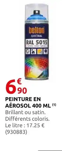 L'offre est disponible dans plusieurs magasins, vérifiez tous les produits pour obtenir le Peinture en aérosol 400 ml le moins cher. Si vous souhaitez savoir si l'article est en vente avec une plus grosse remise dans un autre magasin, consultez la catégorie 'Bricolage'. Ces offres pourraient aussi vous intéresser : SPECTRUM Peinture en aérosol haute brillance, WD-40 Aérosol pro & Aérosol Guêpes & frelons.