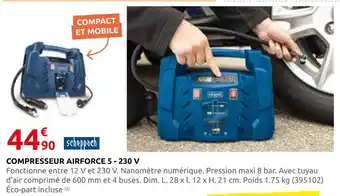L'offre est disponible dans plusieurs magasins, vérifiez tous les produits pour obtenir le Scheppach compresseur airforce 5 - 230 v le moins cher. Si vous souhaitez savoir si l'article est en vente avec une plus grosse remise dans un autre magasin, consultez la catégorie 'Bricolage'. Ces offres pourraient aussi vous intéresser : Mini-compresseur 12 v 80w, SCHEPPACH Compresseur portatif air force 5 ac/dc & Compresseur coaxial.