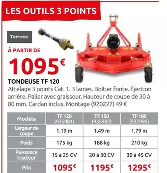 Actuellement, Temver tondeuse tf 120 est en promotion chez Rural Master. Toutes les informations utiles comme le prix, les conditions et la durée de validité sont affichées sur cette page. Consultez également les promotions similaires pour Temver tondeuse tf 120, afin de faire le meilleur choix. La promo Temver tondeuse tf 120 est valable du 27-04-2026 au 23-05-2026. Si elle est expirée, regardez les autres offres équivalentes. Vous pouvez aussi suivre cette catégorie de produit pour être alerté lorsqu’une nouvelle promotion Temver tondeuse tf 120 apparaît chez Rural Master.Questions fréquemment posées au sujet de Temver tondeuse tf 120
