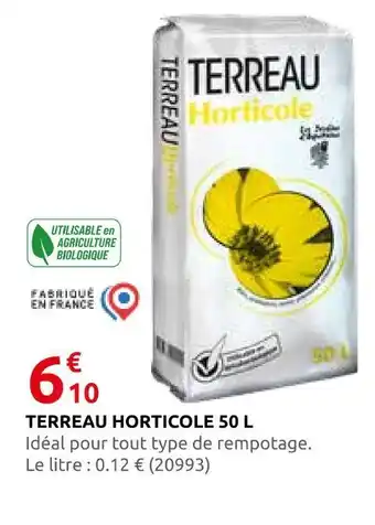 En plus de l'offre Terreau horticole 50 l, Rural Master propose une large gamme de produits. Consultez le Catalogue Rural Master hebdomadaire pour découvrir les meilleures offres et promotions. En plus de Terreau horticole 50 l, il y a aussi : TERREAU HORTICOLE, TERREAU HORTICOLE SOLDOR & FERTILIGÈNE Terreau horticole.