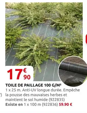 En plus de l'offre Toile de paillage 100 g/m², Rural Master propose une large gamme de produits. Consultez le Catalogue Rural Master hebdomadaire pour découvrir les meilleures offres et promotions. En plus de Toile de paillage 100 g/m², il y a aussi : Toile de paillage non tissé 100 g/m², TOILE DE PAILLAGE & Toile paillage u.