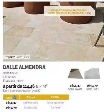 En plus de l'offre Dalle almendra, Samse propose une large gamme de produits. Consultez le Catalogue Samse hebdomadaire pour découvrir les meilleures offres et promotions. En plus de Dalle almendra, il y a aussi : Margelle almendra, Bordure almendra & Dalle.