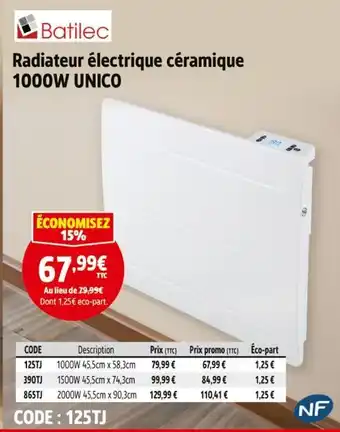 En plus de l'offre Batilec radiateur électrique céramique 1000w unico, Screwfix propose une large gamme de produits. Consultez le Catalogue Screwfix hebdomadaire pour découvrir les meilleures offres et promotions. En plus de Batilec radiateur électrique céramique 1000w unico, il y a aussi : Batilec radiateur à inertie pierre céramique, Radiateur ceramique 500w etna & Tronic radiateur soufflant céramique.