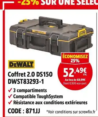 Le prix de l'offre Dewalt coffret 2.0 ds150 dwst83293-1 se trouve également en haut de la page, ainsi que la date à laquelle l'offre est disponible. Vous pouvez également vérifier les prix dans le Catalogue Screwfix actuel ou sur le site Internet de Screwfix. Les offres vous permettent d'acheter les produits Screwfix au prix le plus bas.