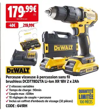 Le prix de l'offre Dewalt perceuse visseuse à percussion sans fil brushless dcd778d2ta li-ion xr 18v 2 x 2ah se trouve également en haut de la page, ainsi que la date à laquelle l'offre est disponible. Vous pouvez également vérifier les prix dans le Catalogue Screwfix actuel ou sur le site Internet de Screwfix. Les offres vous permettent d'acheter les produits Screwfix au prix le plus bas.