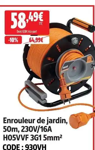 Actuellement en offre chez Screwfix : Enrouleur de jardin, 50m, 230v/16a, h05vvf 3g1 5mm² ✅ Valable du 3-03 au 31-03.