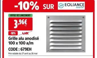 Actuellement en offre chez Screwfix : Eoliance habitat grille alu anodisé 100 x 100 a/m ✅ Valable du 27-04 au 26-05.