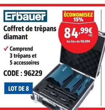 L'offre est disponible dans plusieurs magasins, vérifiez tous les produits pour obtenir le Erbauer coffret de trépan diamant le moins cher. Si vous souhaitez savoir si l'article est en vente avec une plus grosse remise dans un autre magasin, consultez la catégorie 'Bricolage'. Ces offres pourraient aussi vous intéresser : Erbauer disques diamant 125mm, ERBAUER Coffret 100 pieces & Diamant.