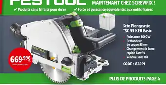 Actuellement en offre chez Screwfix : Festool scie plongeante tsc 55 keb basic ✅ Valable du 7-01 au 3-02.