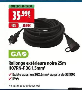 En plus de l'offre Gao rallonge extérieure noire 25m h07rn-f 3g 1.5mm², Screwfix propose une large gamme de produits. Consultez le Catalogue Screwfix hebdomadaire pour découvrir les meilleures offres et promotions. En plus de Gao rallonge extérieure noire 25m h07rn-f 3g 1.5mm², il y a aussi : Gao rallonge pour jardin 25m, Manchon pvc f/f & Té à 67° m/f.