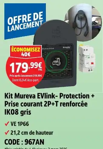 En plus de l'offre Kit mureva evlink - protection + prise courant 2p+t renforcée ik08 gris, Screwfix propose une large gamme de produits. Consultez le Catalogue Screwfix hebdomadaire pour découvrir les meilleures offres et promotions. En plus de Kit mureva evlink - protection + prise courant 2p+t renforcée ik08 gris, il y a aussi : Prise électrique, Serre de jardin renforcée & Complet - kit protection a l'eau sous.