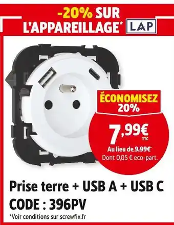 Offre Lap prise terre + usb a + usb c chez Screwfix