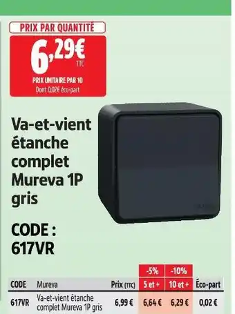 L'offre est disponible dans plusieurs magasins, vérifiez tous les produits pour obtenir le Mureva va-et-vient étanche complet le moins cher. Si vous souhaitez savoir si l'article est en vente avec une plus grosse remise dans un autre magasin, consultez la catégorie 'Bricolage'. Ces offres pourraient aussi vous intéresser : LUMIA Interrupteur va-et-vient complet, Va-et-vient en saillie ip55 ik08 gris mureva & Prise terre étanche complet mureva 1p gris.