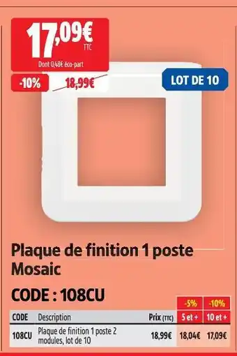 En plus de l'offre Plaque de finition 1 poste mosaic, Screwfix propose une large gamme de produits. Consultez le Catalogue Screwfix hebdomadaire pour découvrir les meilleures offres et promotions. En plus de Plaque de finition 1 poste mosaic, il y a aussi : Poussoir 1 poste blanc mosaic, Prise 2p+t mosaic & Profilé de finition neva max.