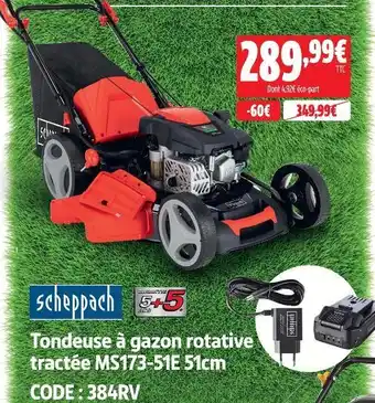 Scheppach tondeuse à gazon rotative tractée ms173-51e 51cm bénéficie actuellement d'une réduction chez Screwfix. Vous trouverez ici toutes les infos utiles sur les prix, la durée de validité et les conditions de l’offre. Pensez à consulter aussi d'autres offres et promotions similaires pour Scheppach tondeuse à gazon rotative tractée ms173-51e 51cm afin d’acheter toujours au bon prix. La promo Scheppach tondeuse à gazon rotative tractée ms173-51e 51cm est valable du 01-04-2026 au 26-04-2026. Offre terminée ? Pas de souci. D'autres offres sur ces produits sont peut-être déjà disponibles. Vous pouvez suivre cette catégorie de produits pour rester informé en cas de nouvelle promotion Scheppach tondeuse à gazon rotative tractée ms173-51e 51cm chez Screwfix. En comparant les offres, vous êtes sûr d’acheter au prix le plus bas possible.Questions fréquemment posées au sujet de Scheppach tondeuse à gazon rotative tractée ms173-51e 51cm