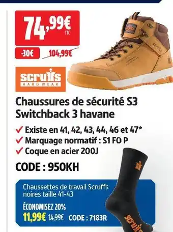 Le prix de l'offre Scruffs chaussures de sécurité s3 switchback 3 havane se trouve également en haut de la page, ainsi que la date à laquelle l'offre est disponible. Vous pouvez également vérifier les prix dans le Catalogue Screwfix actuel ou sur le site Internet de Screwfix. Les offres vous permettent d'acheter les produits Screwfix au prix le plus bas.