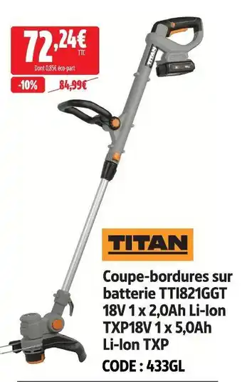 Actuellement en offre chez Screwfix : Titan coupe-bordures sur batterie tti821ggt 18v 1 x 2,0ah li-ion txp18v 1 x 5,0ah li-ion txp ✅ Valable du 3-03 au 31-03.