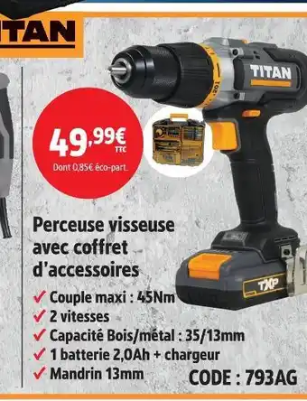 L'offre est disponible dans plusieurs magasins, vérifiez tous les produits pour obtenir le Titan perceuse visseuse avec coffret d'accessoires le moins cher. Si vous souhaitez savoir si l'article est en vente avec une plus grosse remise dans un autre magasin, consultez la catégorie 'Bricolage'. Ces offres pourraient aussi vous intéresser : Perceuse-Visseuse 20V, PERCEUSE VISSEUSE SANS FIL 12V & SCHEPPACH Perceuse-visseuse 20v.