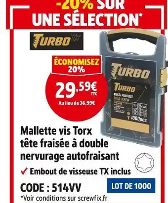 Turbo mallette vis torx tête fraisée à double nervurage autofraisant bénéficie actuellement d'une réduction chez Screwfix. Vous trouverez ici toutes les infos utiles sur les prix, la durée de validité et les conditions de l’offre. Pensez à consulter aussi d'autres offres et promotions similaires pour Turbo mallette vis torx tête fraisée à double nervurage autofraisant afin d’acheter toujours au bon prix. La promo Turbo mallette vis torx tête fraisée à double nervurage autofraisant est valable du 07-01-2026 au 03-02-2026. Offre terminée ? Pas de souci. D'autres offres sur ces produits sont peut-être déjà disponibles. Vous pouvez suivre cette catégorie de produits pour rester informé en cas de nouvelle promotion Turbo mallette vis torx tête fraisée à double nervurage autofraisant chez Screwfix. En comparant les offres, vous êtes sûr d’acheter au prix le plus bas possible.Questions fréquemment posées au sujet de Turbo mallette vis torx tête fraisée à double nervurage autofraisant