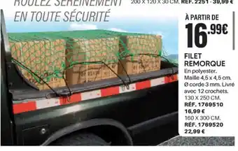 L'offre est disponible dans plusieurs magasins, vérifiez tous les produits pour obtenir le FILET REMORQUE le moins cher. Si vous souhaitez savoir si l'article est en vente avec une plus grosse remise dans un autre magasin, consultez la catégorie 'Bricolage'. Ces offres pourraient aussi vous intéresser : Filet élastique pour remorque, Filet de protection pour remorque avec tendeur intégré et 10 crochets d'attache & 9317 tracteur avec remorque.