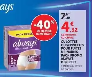 En plus de l'offre Always Discreet, Super U propose une large gamme de produits. Consultez le Catalogue Super U hebdomadaire pour découvrir les meilleures offres et promotions. En plus de Always Discreet, il y a aussi : Always Discreet, ALWAYS DISCREET Incontinence & ALWAYS DISCREET Pack Promo.
