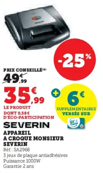 Actuellement en offre chez Super U : Appareil a croque monsieur severin ✅ Valable du 3-02 au 15-02.